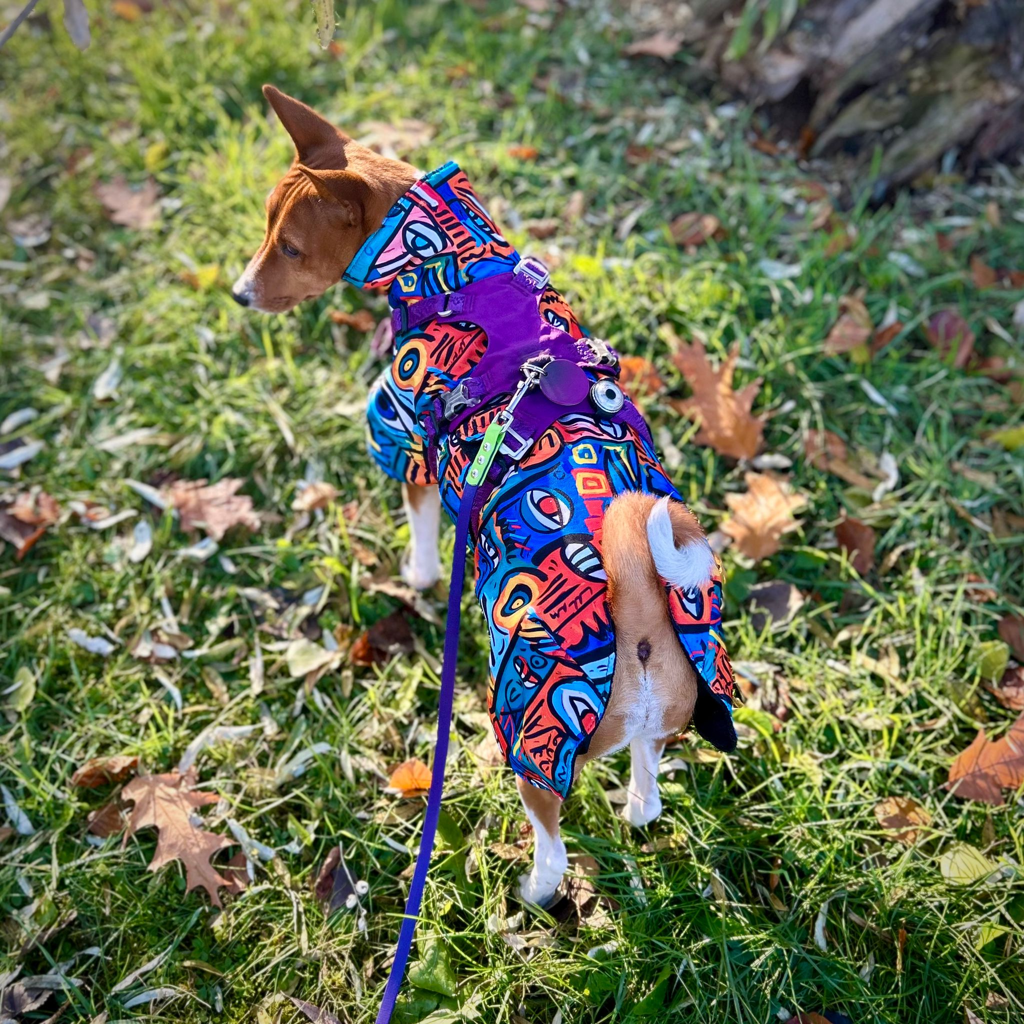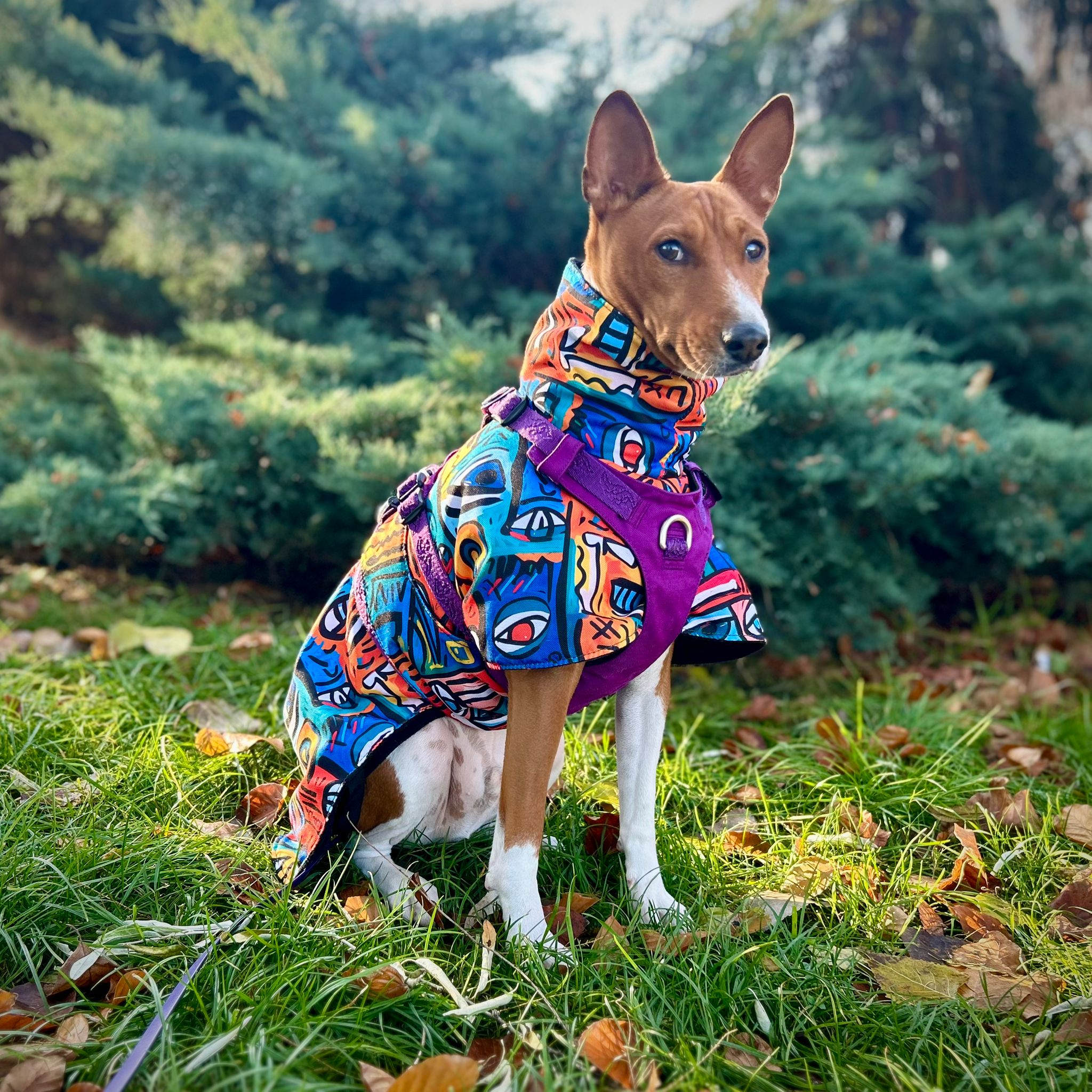Płaszczyk dla basenji zapewnia swobodę i nie ogranicza ruchu psa. Posiada wbudowane szelki z możliwością łatwej regulacji obwodu klatki piersiowej za pomocą klamry i paska lub rzepu (do wyboru w opcjach zakupu), które dokładnie przylegają do ciała zwierzaka.